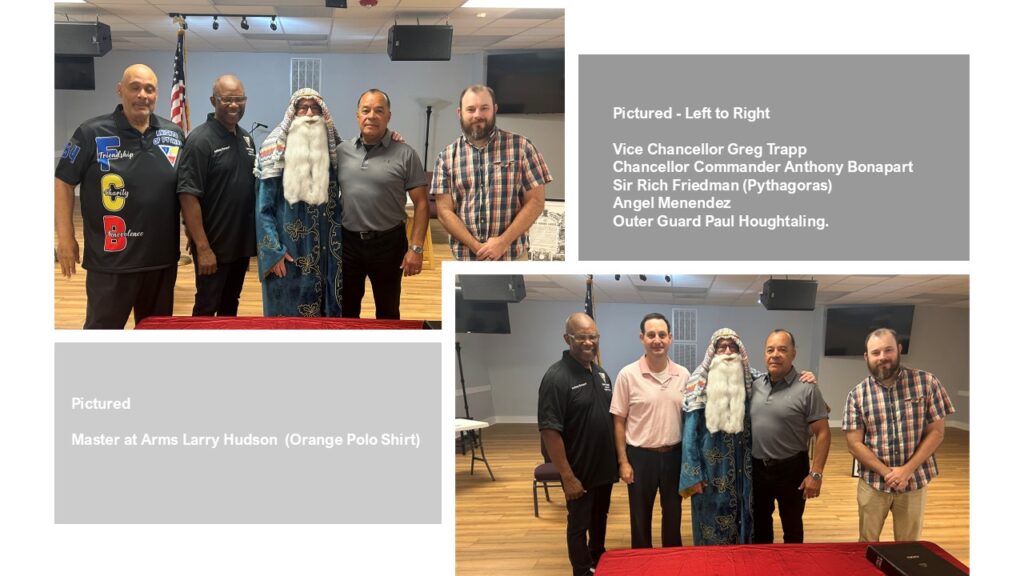 Chancellor Commander Anthony Bonapart officiated the initiation ceremony for Angel Menendez into Centre Lodge No. 3 of the Knights of Pythias, representing the Domain of North Carolina. This significant event took place in Raleigh, North Carolina, and was further elevated by the impressive performance of Sir Rich Friedman as Pythagoras. This inspiring occasion not only welcomed a new member but also celebrated the values and traditions of our esteemed organization.